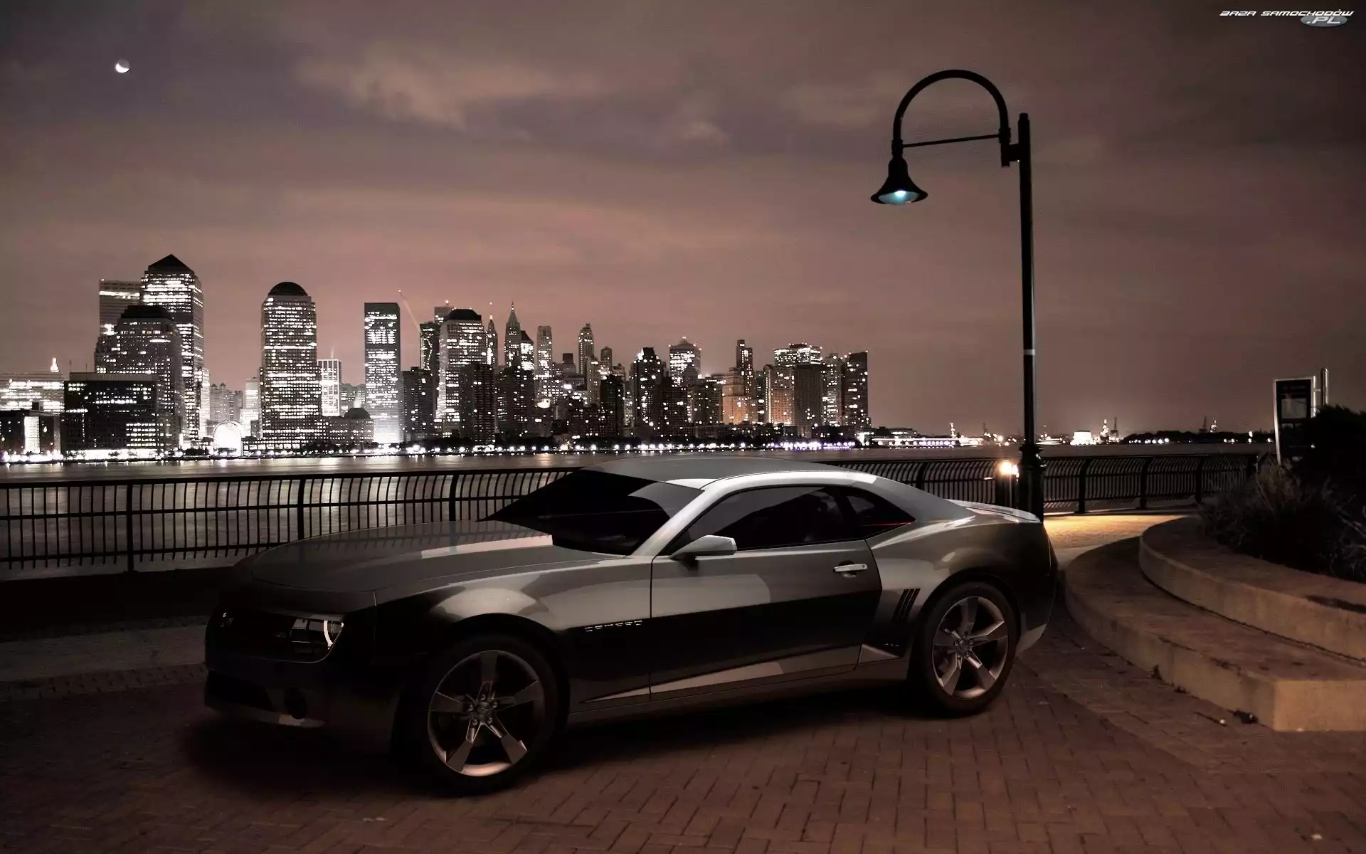 Miasto, Chevrolet, Noc, Latarnia, Camaro, Rzeka- Zdjęcia samochodów